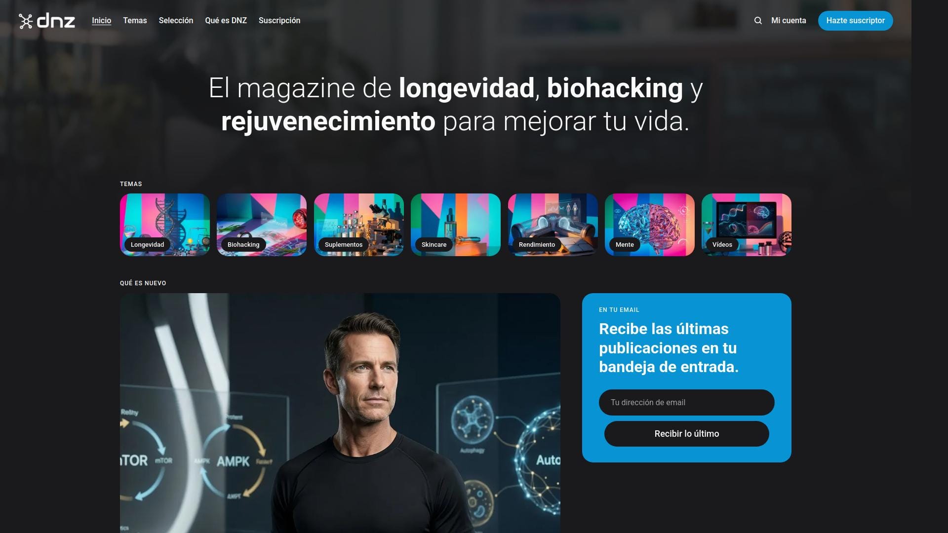 DNZ es una plataforma premium de suscripción en español centrada en longevidad, rejuvenecimiento, suplementación, skincare, rendimiento y mente. Ofrece artículos, análisis, programas prácticos y herramientas de apoyo como su Coach IA para ayudar a suscriptores exigentes a aprender qué merece realmente la pena.